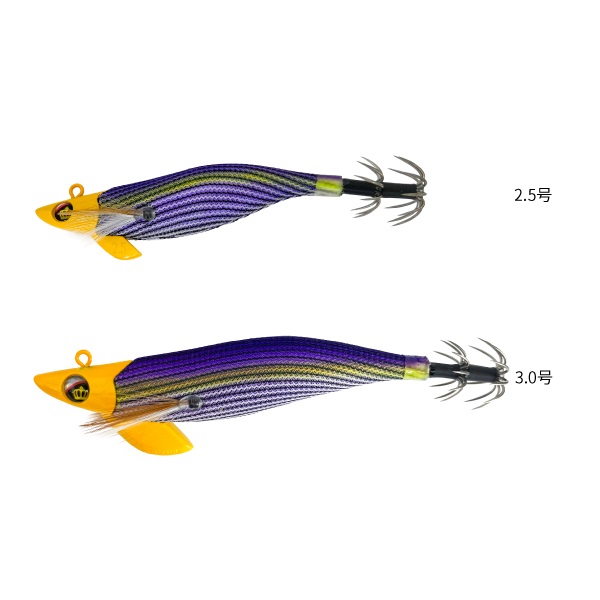 パープルボディにパープルボーターの布を巻いたティップランの王道カラー。ヘッドカラーをイエローにすることで、回収時に水面で目立ち、巻き込みを防ぎやすくしてあります。